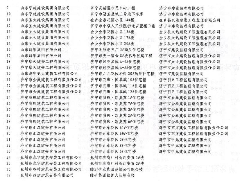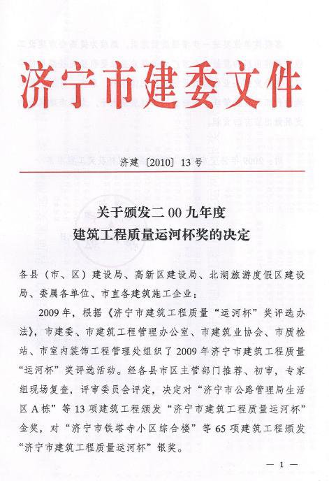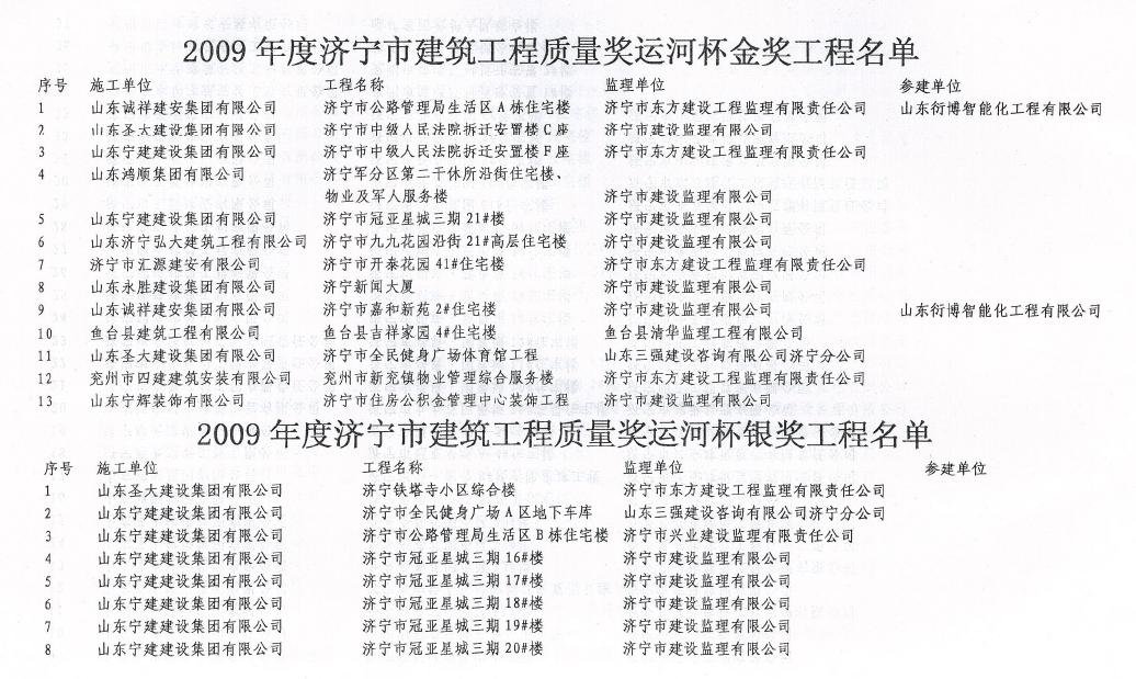 祝賀我公司所監理的工程在2009年濟寧市建筑工程質量“運河杯”獎評選活動中取得優異成績,有7項獲得2009年度運河杯金獎,占金獎總數的一半以上,11項獲得2009年度運河杯銀獎。