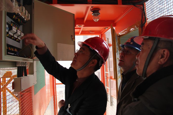 評(píng)審專家對(duì)施工電梯檢測(cè)進(jìn)行現(xiàn)場(chǎng)評(píng)審