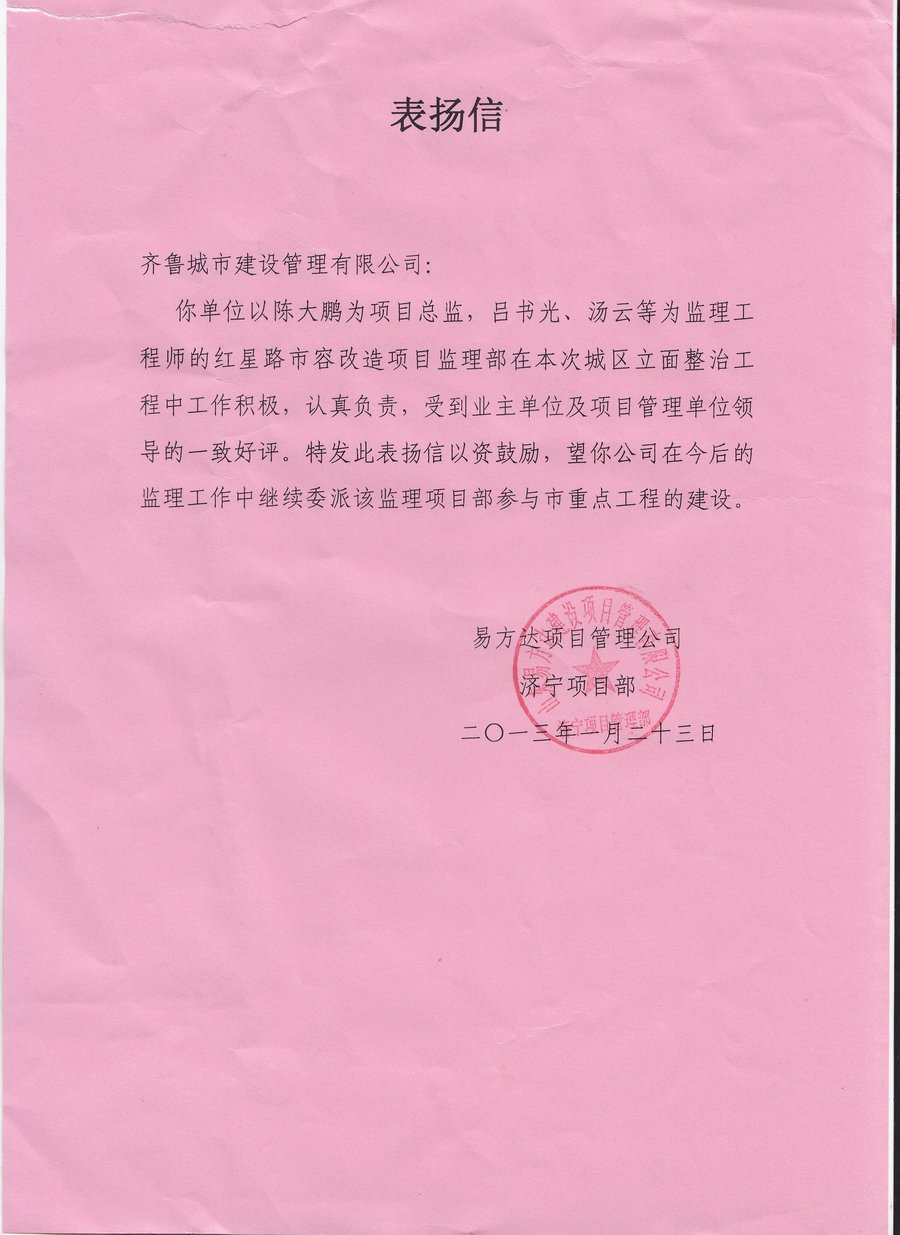 你單位以陳大鵬為項(xiàng)目總監(jiān)、呂書光、湯云等為監(jiān)理工程師的紅星路市容改造項(xiàng)目監(jiān)理部在本次城區(qū)立面整治工程中工作積極,認(rèn)真負(fù)責(zé),受到業(yè)主單位及項(xiàng)目管理單位領(lǐng)導(dǎo)的一致好評(píng)。特發(fā)此表揚(yáng)信以資鼓勵(lì),望你公司在今后的監(jiān)理工作中繼續(xù)委派該項(xiàng)目監(jiān)理部參與市重點(diǎn)工程的建設(shè)。