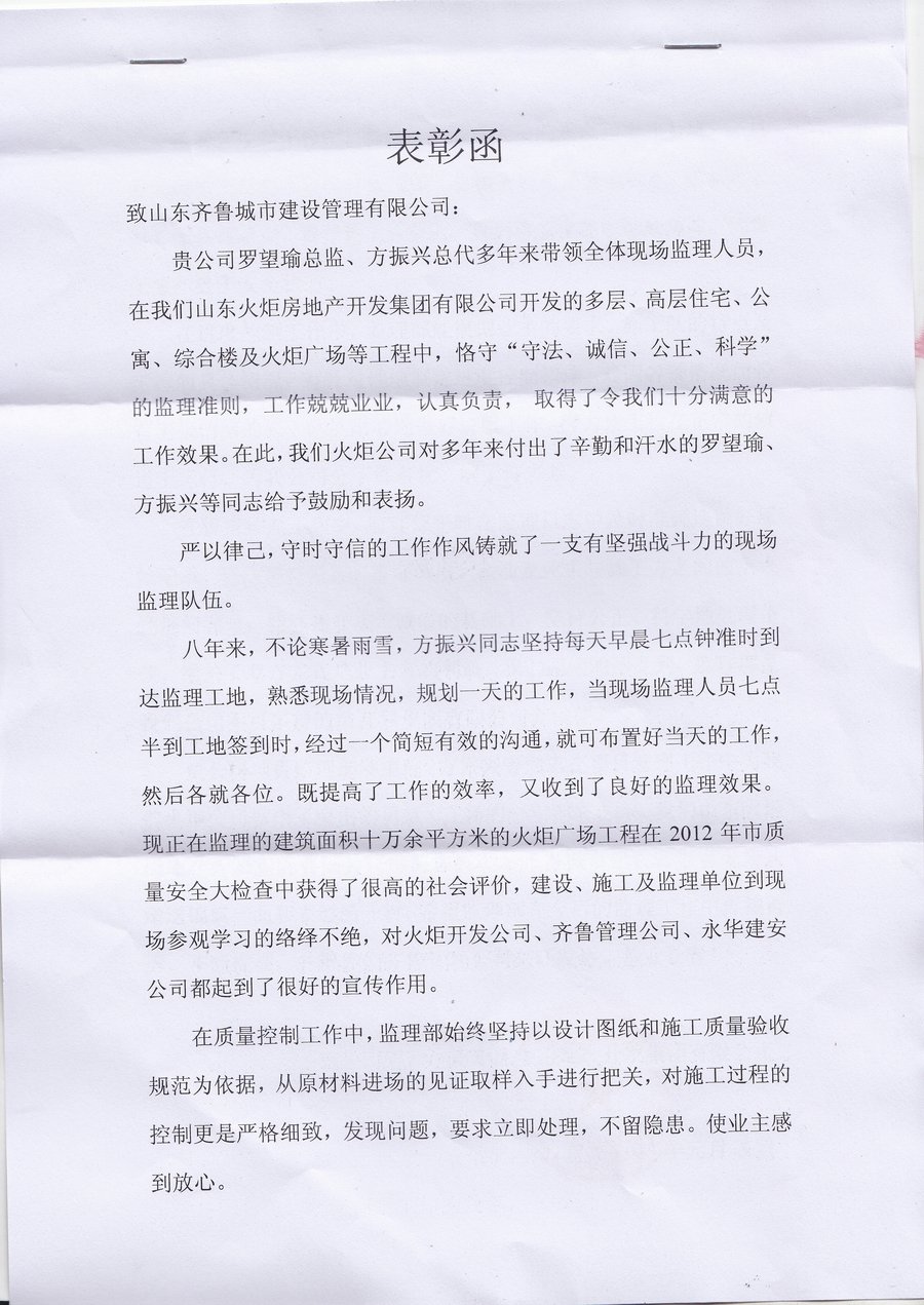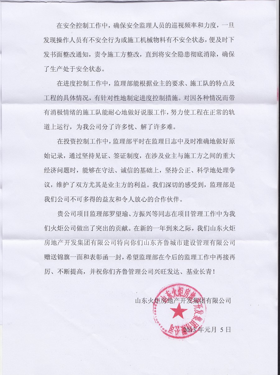 2013年元月五日,火炬房地產集團張海青副總、孔偉總工、宮紅濤經理一行五人來到山東齊魯城市建設管理有限公司,為感謝火炬廣場項目監理部送來感謝信及錦旗,受到齊魯管理王華董事長熱情接待。