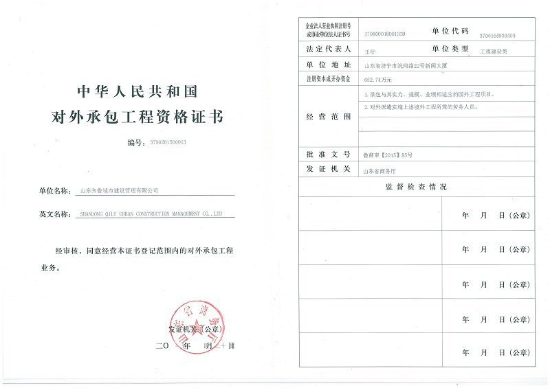 4月20日,我公司對外承包工程資格正式獲得審批,并獲得山東省商務廳頒發的《中華人民共和國對外承包工程資格證書》。這代表著我公司已經具備赴境外從事工程工作的資格。