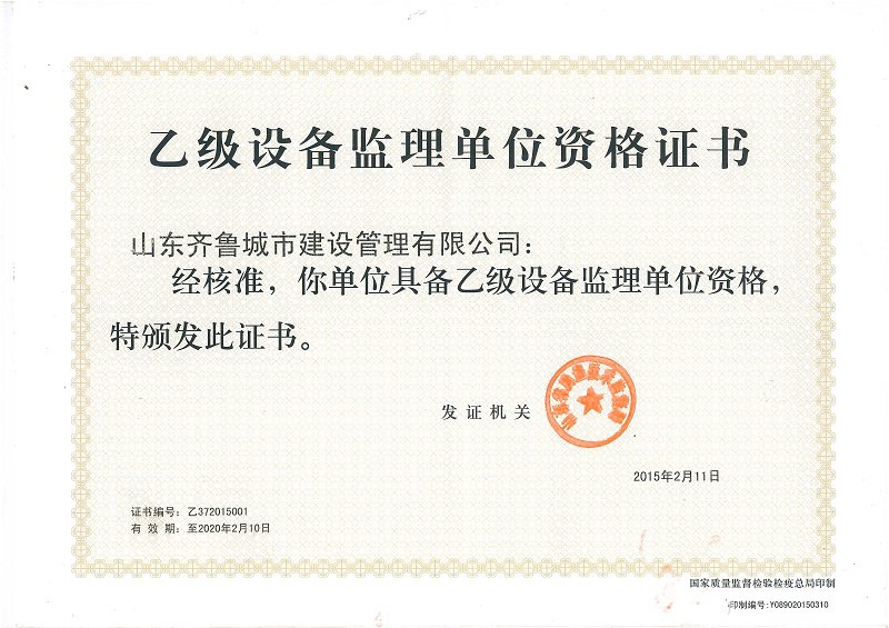 近日,山東齊魯城市建設(shè)管理有限公司又增加一項(xiàng)新的極有份量的業(yè)務(wù)監(jiān)理資質(zhì):乙級(jí)設(shè)備監(jiān)理資格。由國(guó)家質(zhì)量監(jiān)督檢驗(yàn)檢疫總局統(tǒng)一印制證書(shū),檢驗(yàn)的設(shè)備監(jiān)理專(zhuān)業(yè)范圍:
