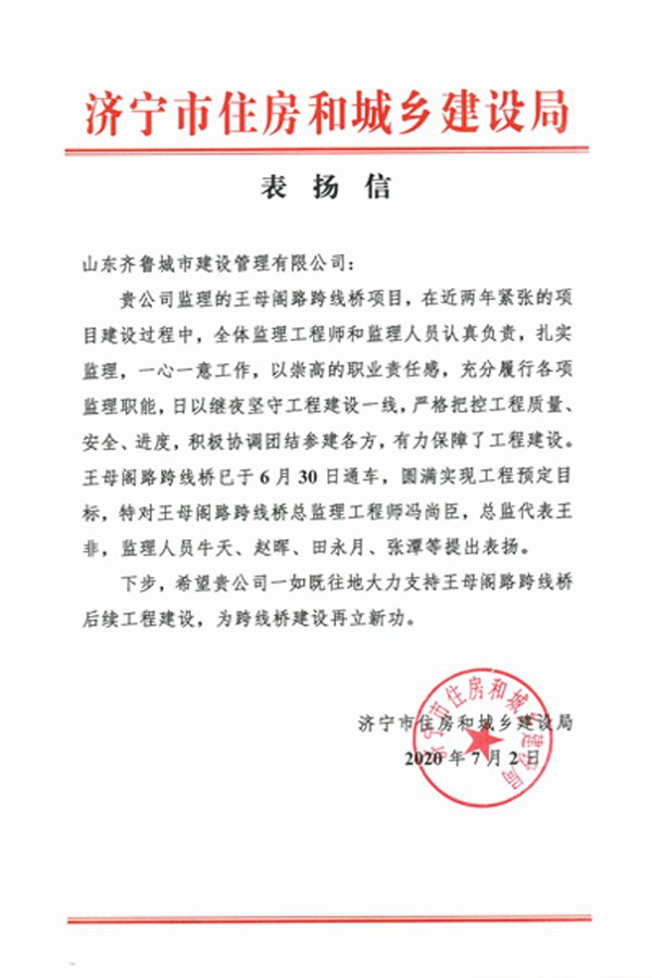 2020年7月2日,濟寧市住房和城鄉建設局發來表揚信,對王母閣路跨線橋總監理工程師馮尚臣,總監代表王非,監理人員牛天、趙暉、田永月、張潭等在監理工作中對工程認真負責、嚴格監理、熱情服務,特提出表揚。能夠得到領導的肯定,是對我們公司監理人員的高度評價,希望公司員工向他們學習,望王母閣路跨線橋監理部的人員戒驕戒躁、再接再厲,以更加飽滿的熱情投入到工程后期的工作中去。