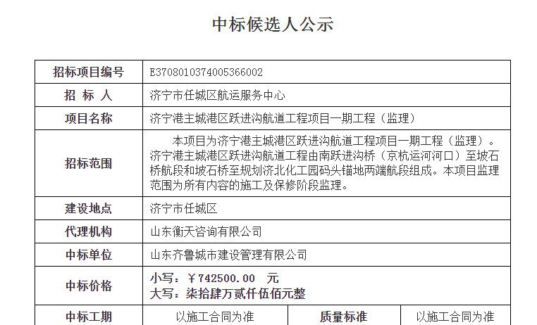 祝賀我公司濟寧港主城港區(qū)躍進溝航道工程項目一期工程(監(jiān)理)中標