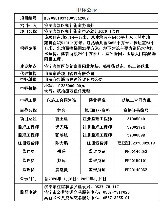 祝賀我公司濟寧高新區柳行街道中心幼兒園項目監理中標